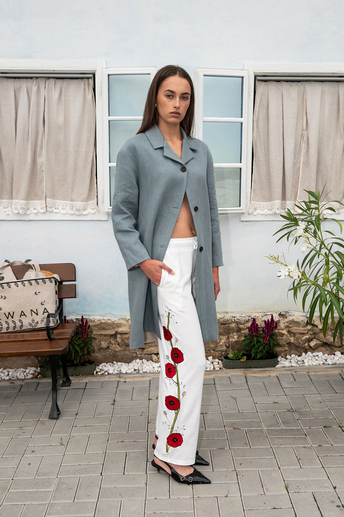 Dámsky kabát z čistej konopnej tkaniny s herringbone väzbou. Elegantný, priedušný a nadčasový kúsok, ktorý spája prírodnú textúru konopy s minimalistickým dizajnom a pohodlným strihom.
