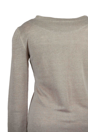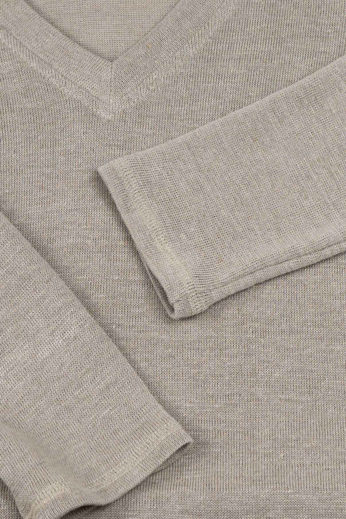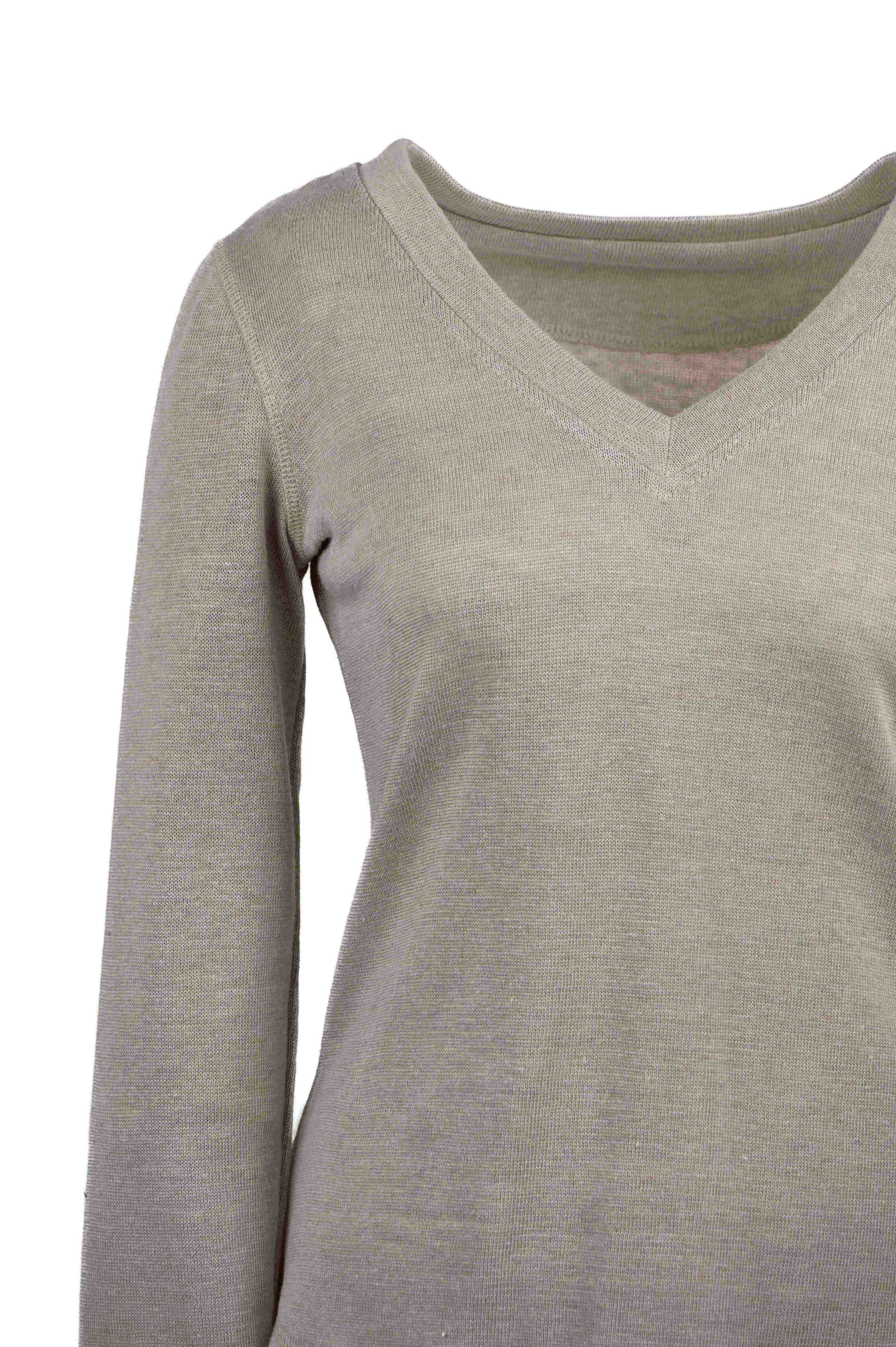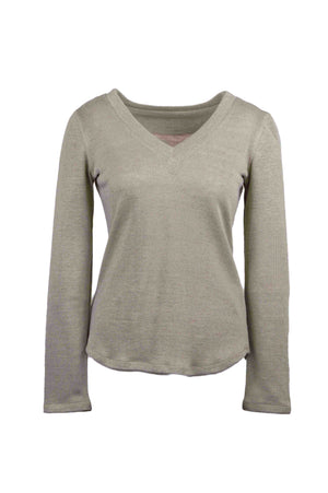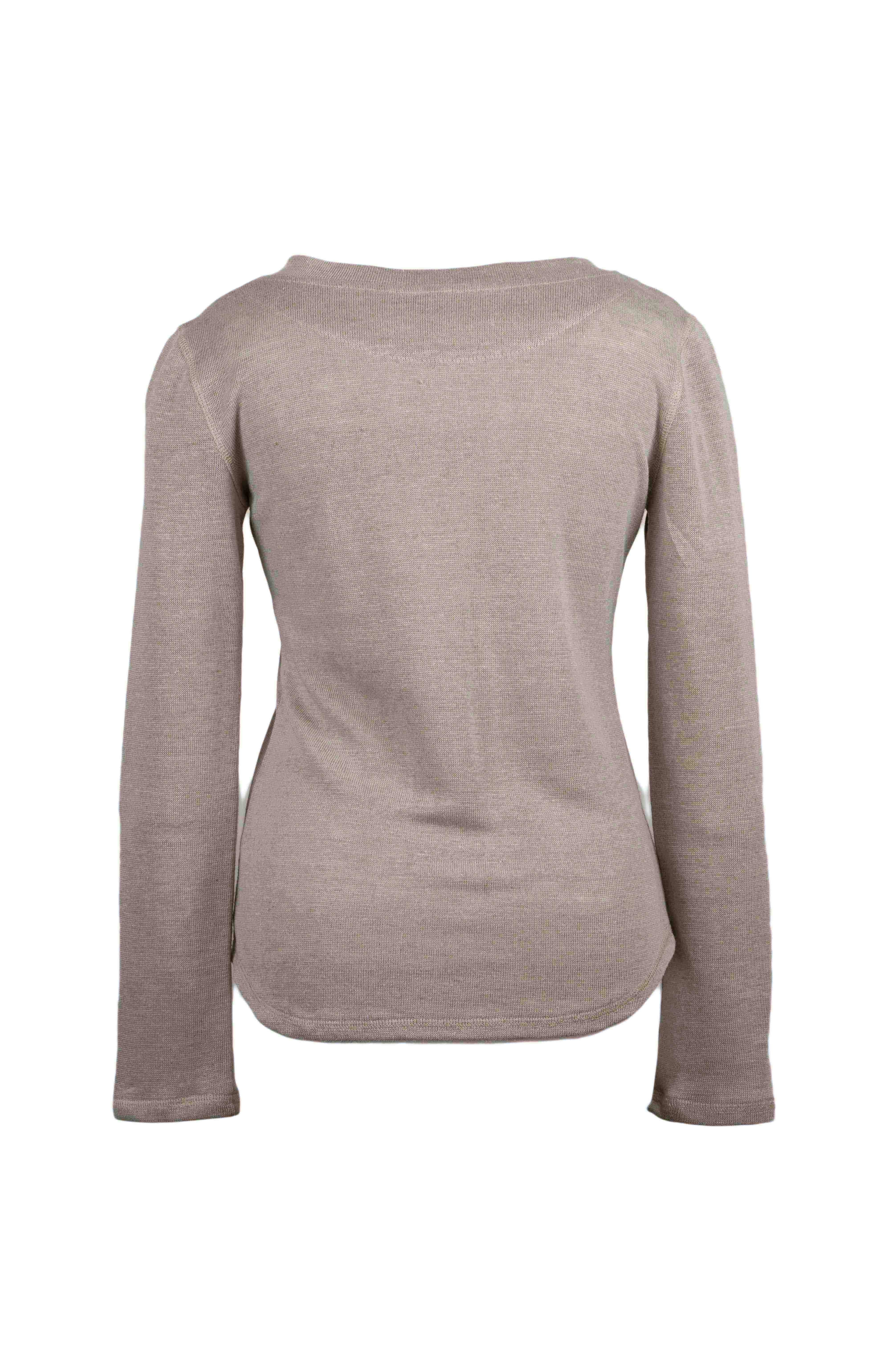Konopné tričko voľnejšieho ženského strihu s olemovaným výstrihom do V. Dlhé rukávy, spodok zaoblený na obidvoch stranách.