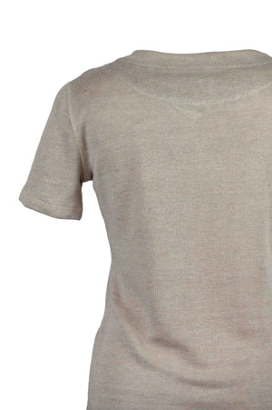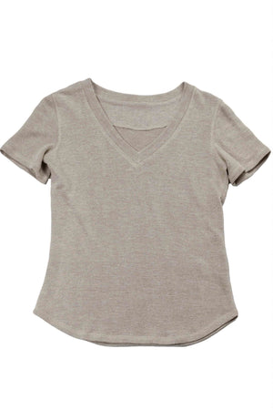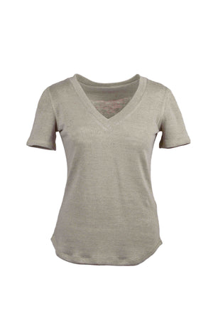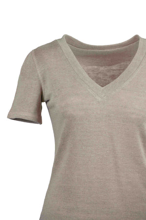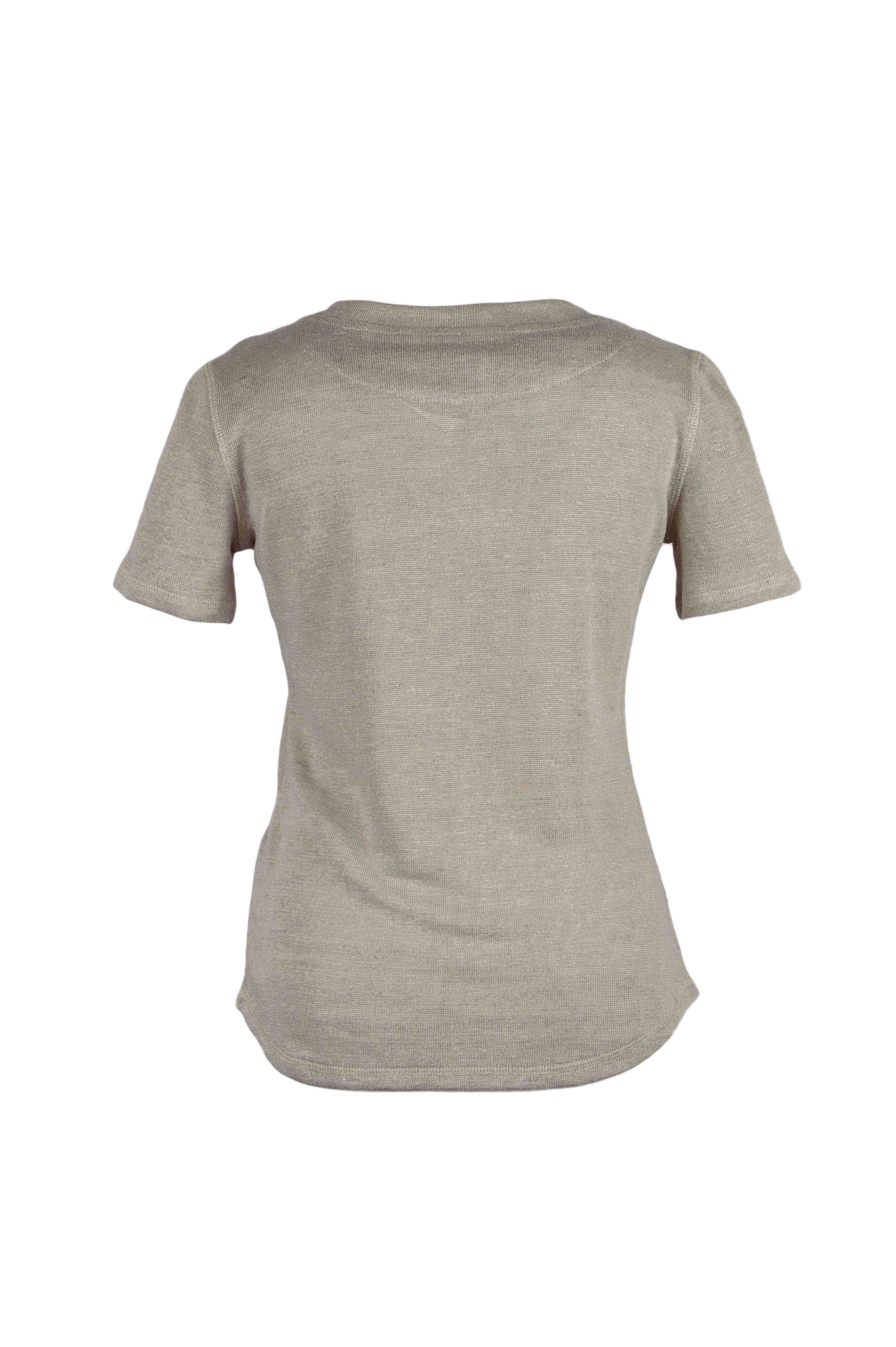 Konopné tričko voľnejšieho ženského strihu s olemovaným výstrihom do V. Krátke rukávy, spodok zaoblený na obidvoch stranách.