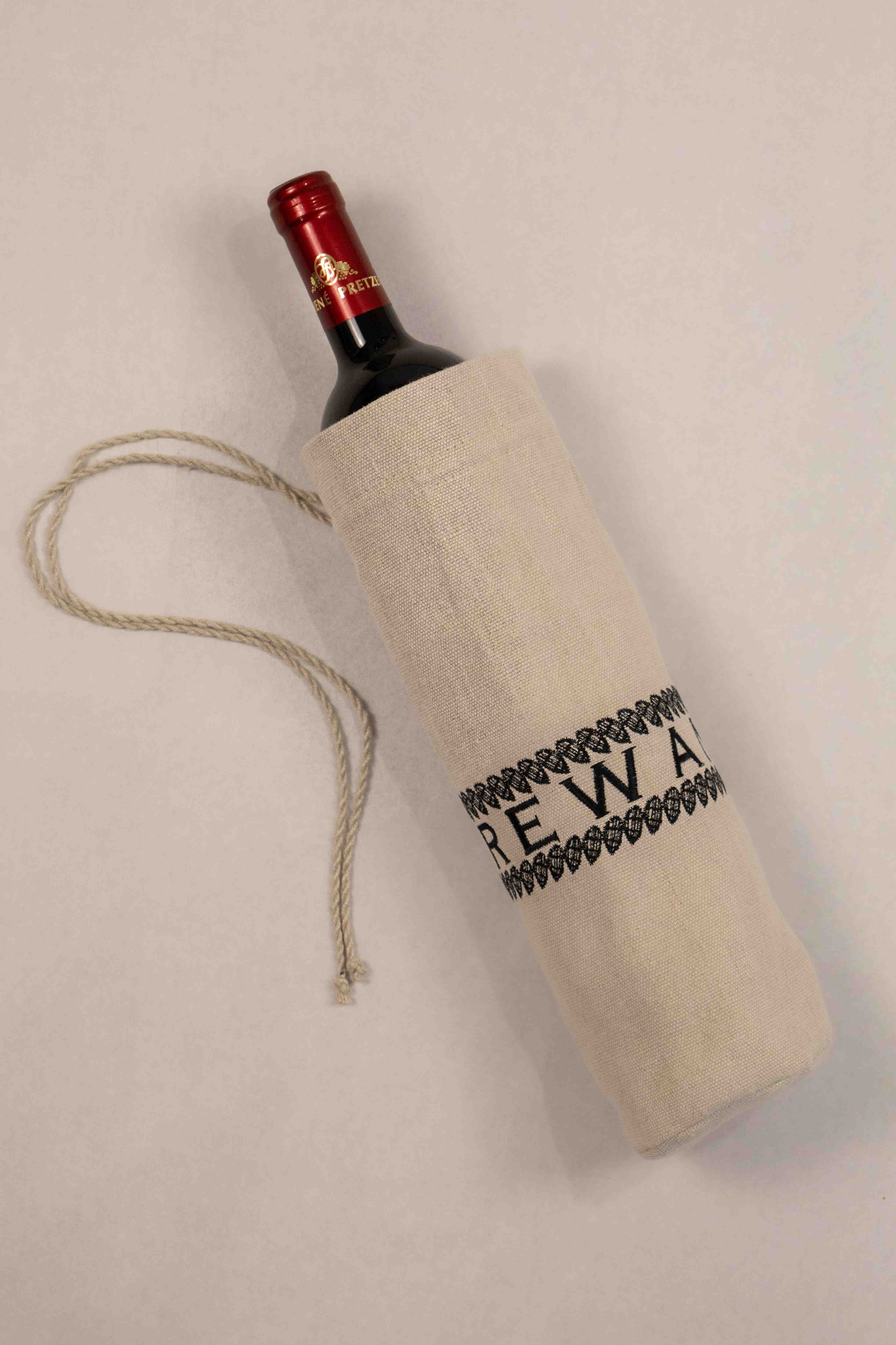 Konopný obal na fľašu s originálnou výšivkou, ideálny na darovanie aj opakované používanie. Prírodná tkanina je pevná, priedušná a dodáva fľaši elegantný, udržateľný vzhľad.