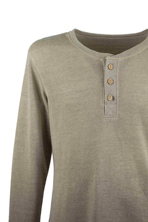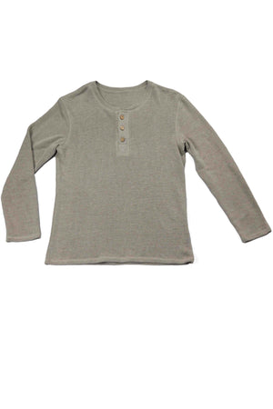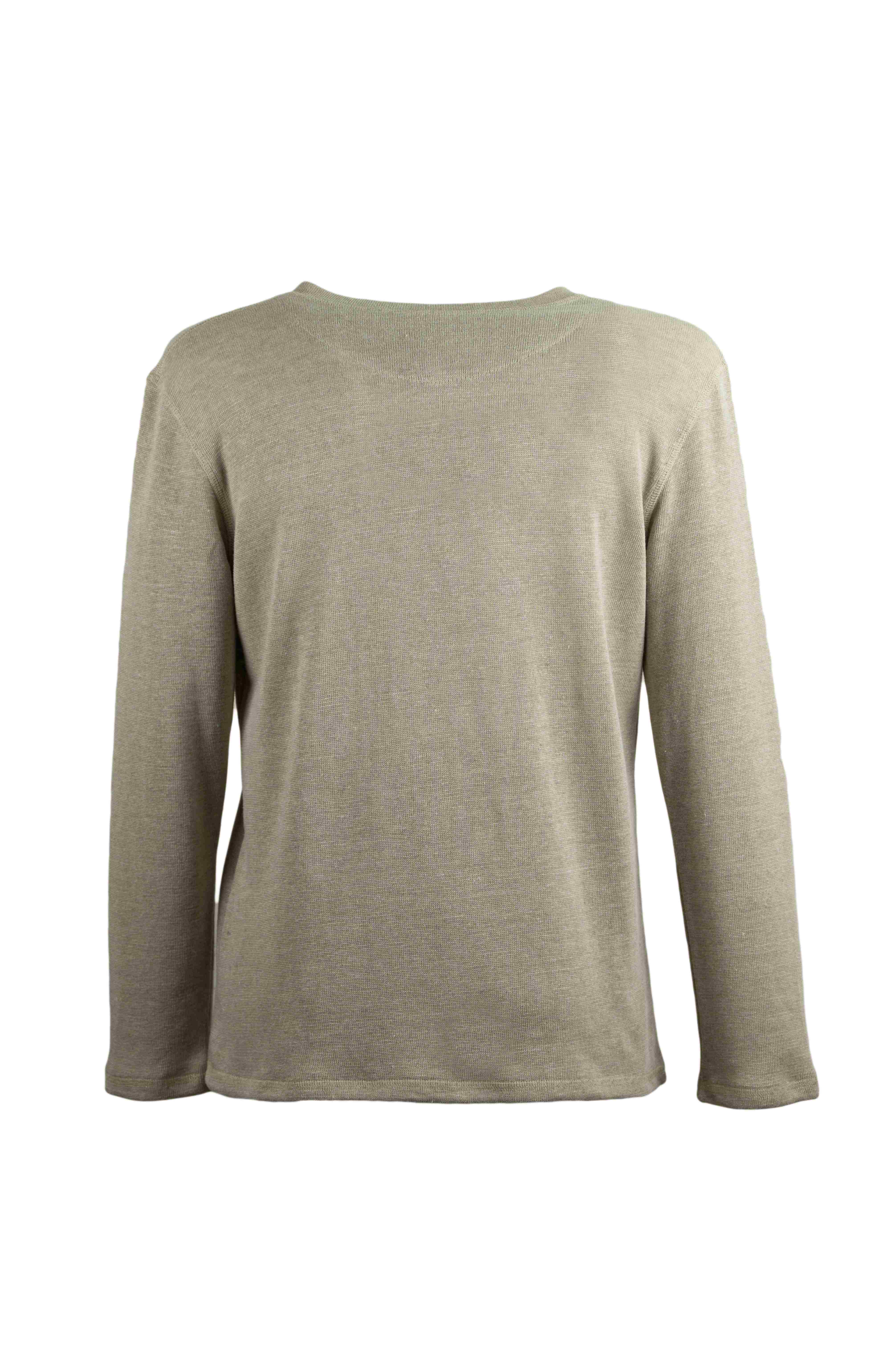 Tričko s dlhým rukávom s légou na gombíky z nefarbeného úpletu z čistej konopnej látky. Mäkké, prieduné a pohodlné na kadodenné nosenie. Spája udratenosa leérny tl..