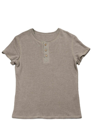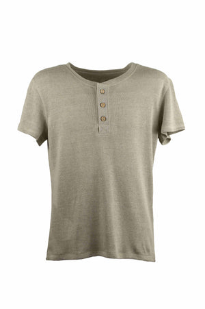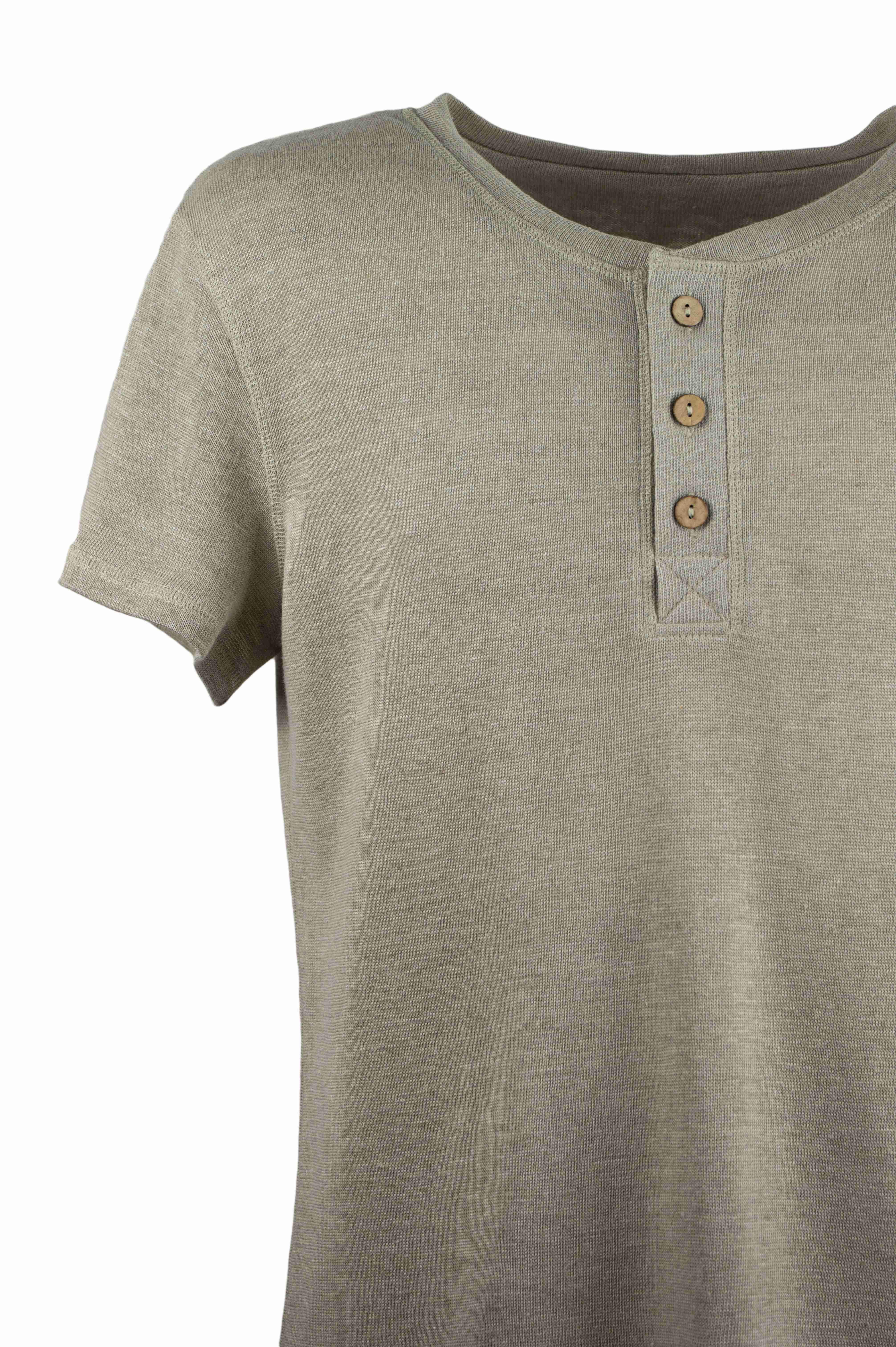 Tričko s krátkym rukávom s légou na gombíky z nefarbeného úpletu z čistej konopnej látky. Mäkké, prieduné a pohodlné na kadodenné nosenie. Spája udratenosa leérny tl.